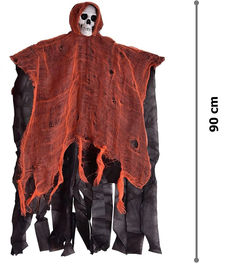 Mey İthalat® Led Işıklı Kahkaha Atan Sesli Sensörlü Ürpertici Kuru Kafa Korku Hayalet Saçaklı Dekor 90x50 cm