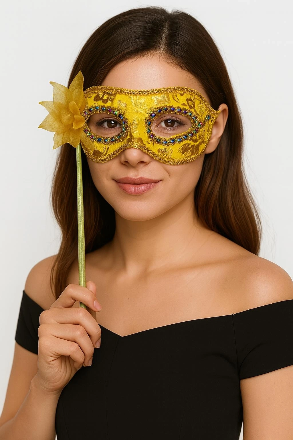 Mey İthalat® Lüks Taşlı Saplı Maskeli Balo Maskesi Altın Renk 35 cm