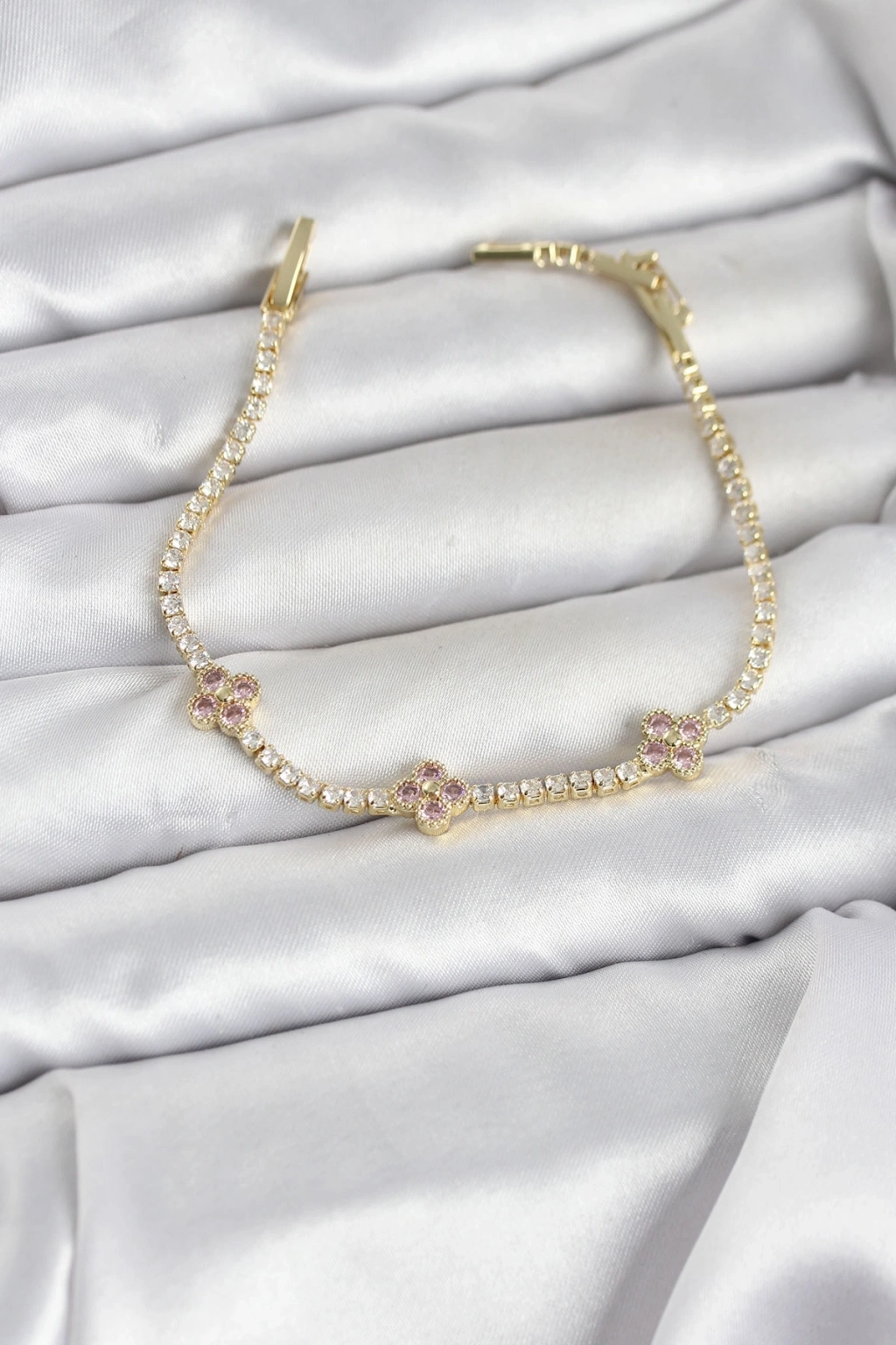 Mey İthalat® Pembe Yonca Detaylı Zirkon Taşlı Gold Renk Pirinç Su Yolu Kadın Bileklik