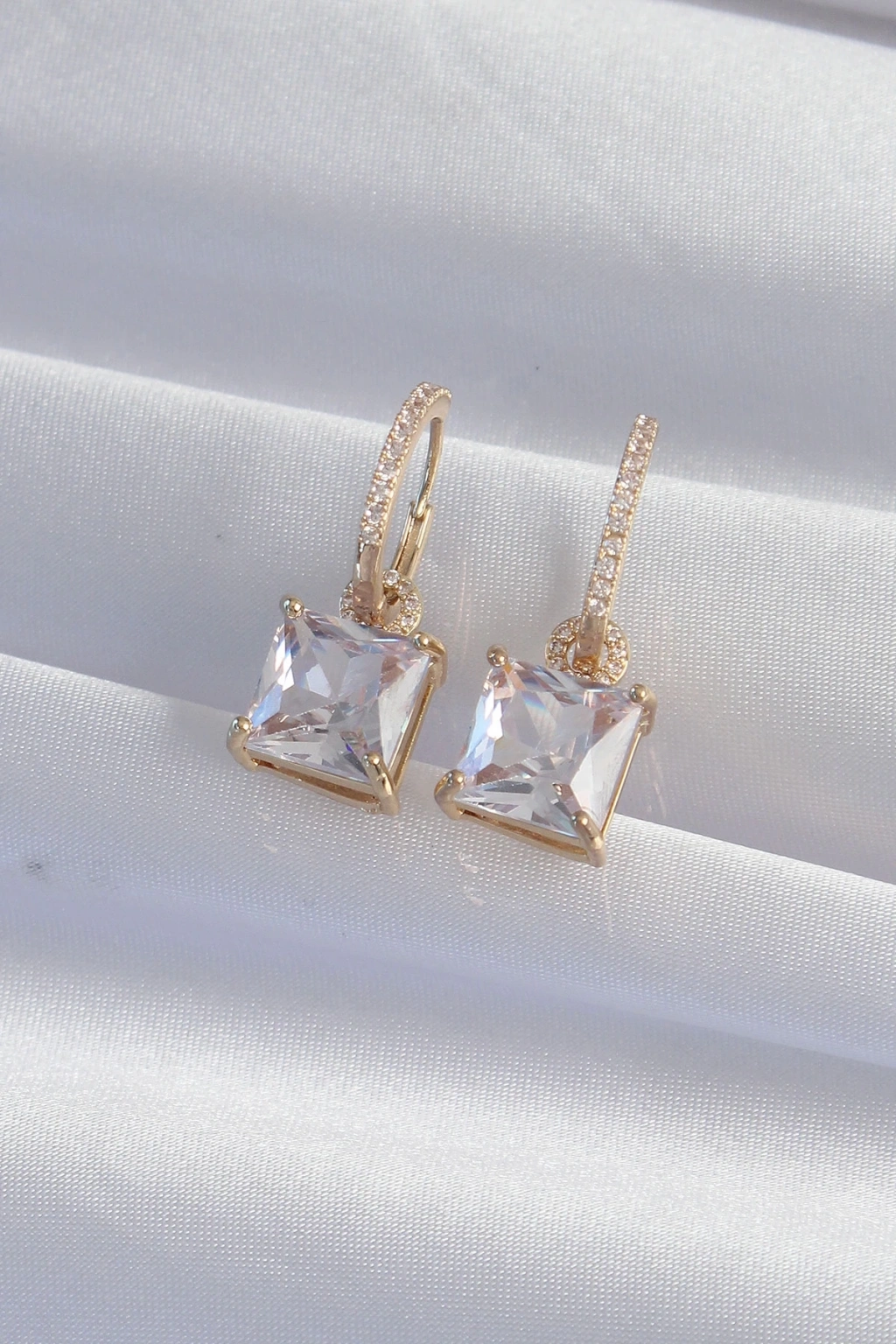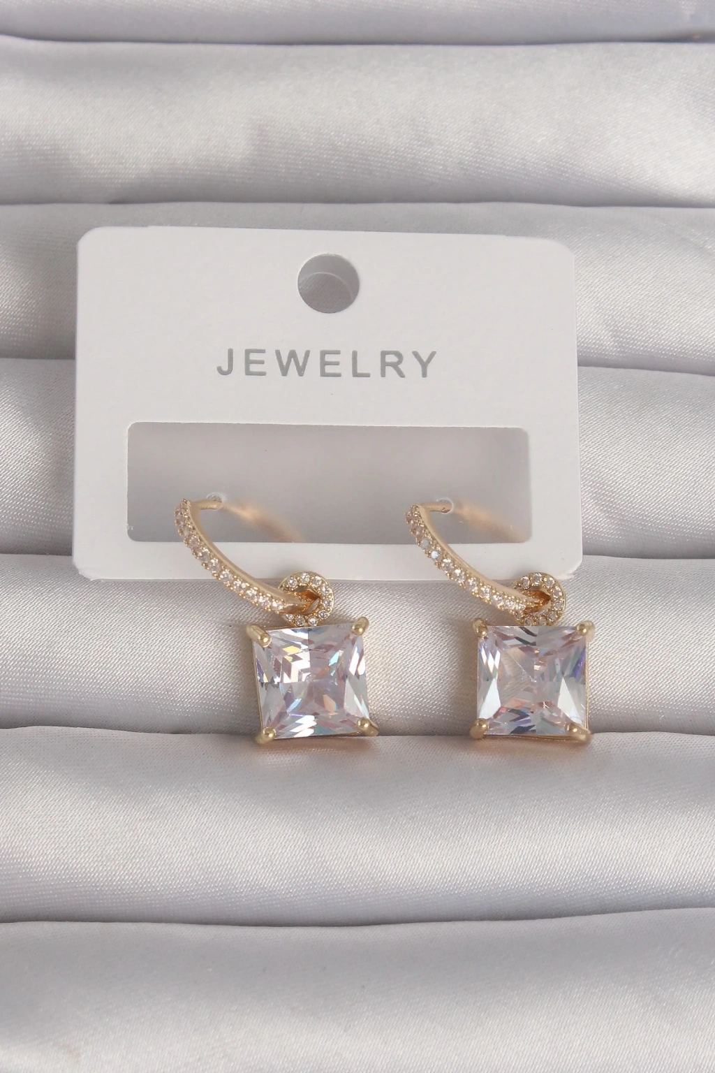 Mey İthalat® Pirinç Gold Renk Kare Zirkon Taşlı Halka Küpe