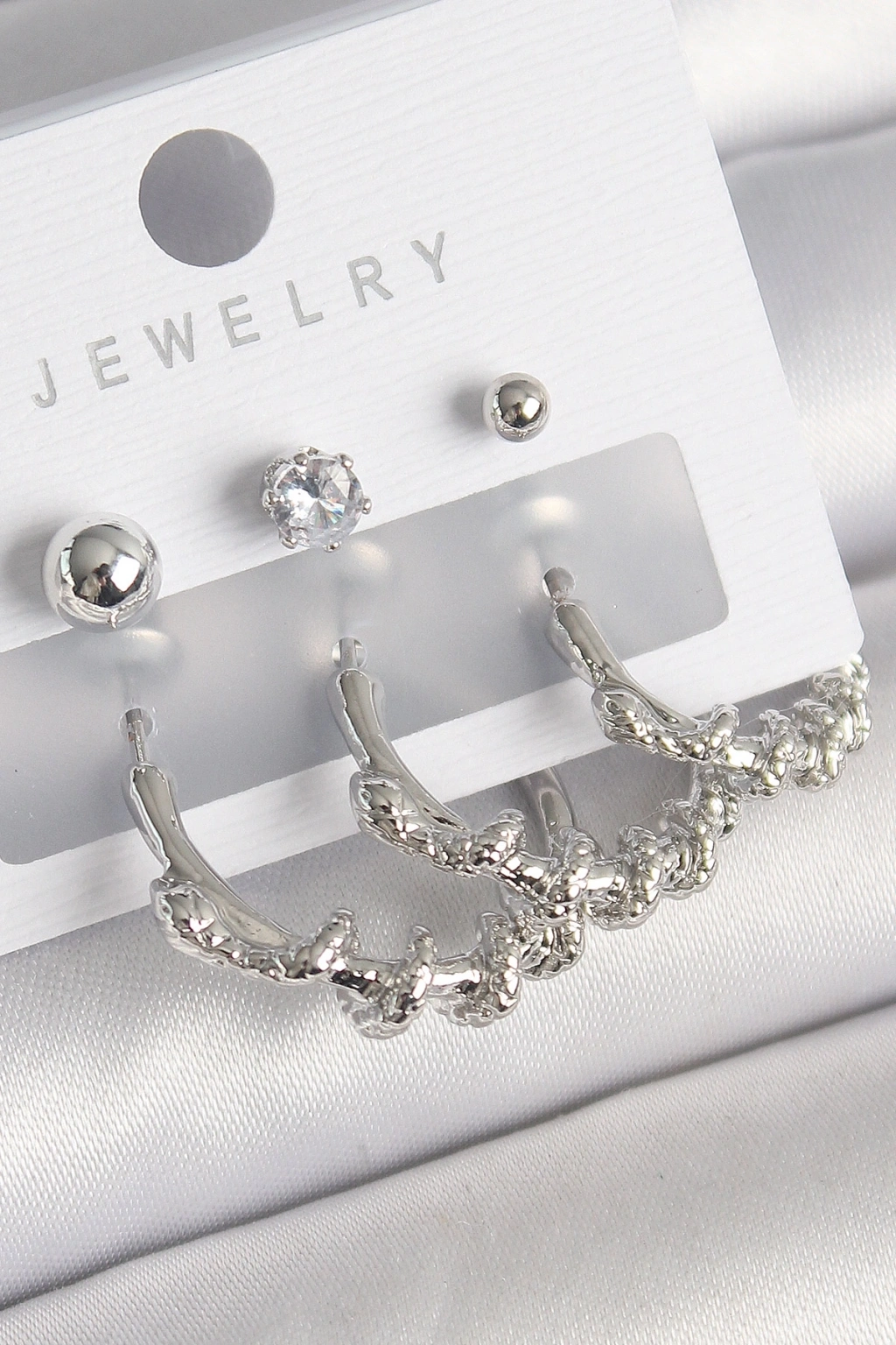 Mey İthalat® Pirinç Gümüş Renk Sarmal Yılan Halka Model Zirkon Taşlı Topçuk Detay Kadın Küpe Seti