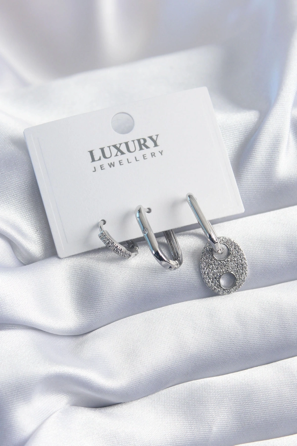 Mey İthalat® Pirinç Gümüş Renk Zirkon Taşlı 3'lü Kadın Küpe Seti
