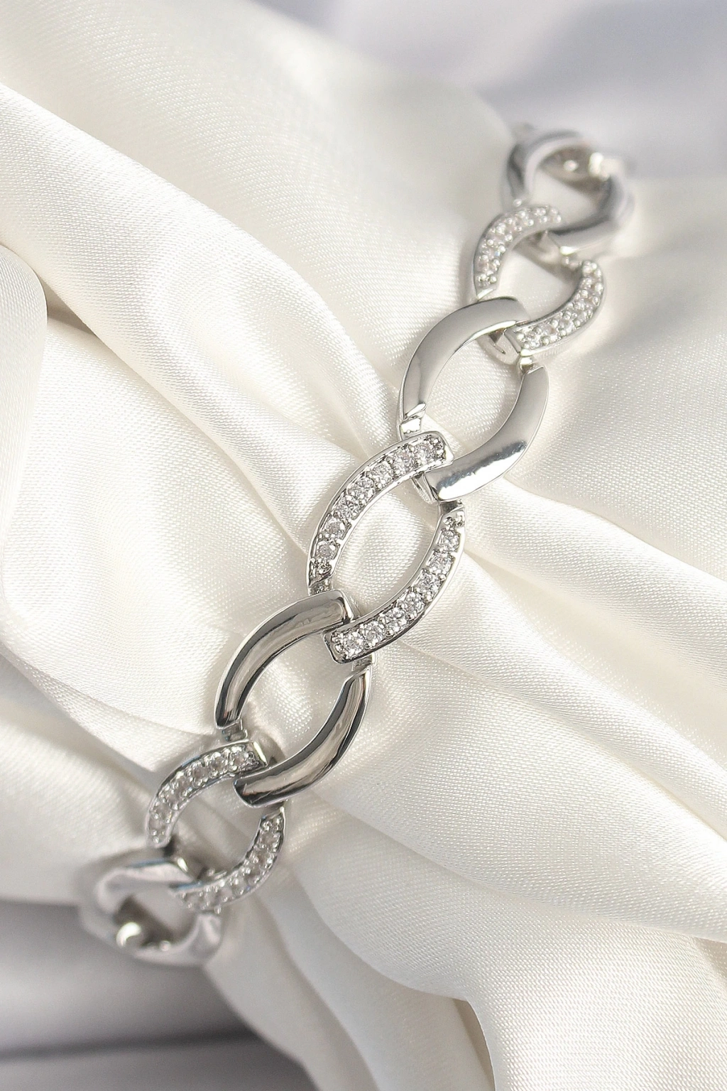 Mey İthalat® Pirinç Gümüş Renk Zirkon Taşlı Oval Zincir Model Kadın Bileklik
