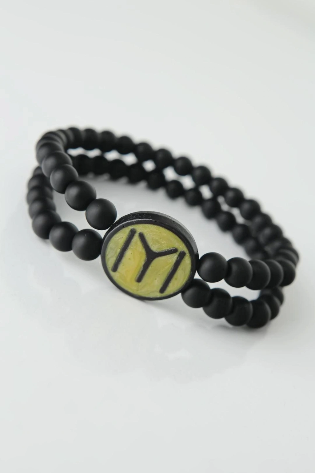 Mey İthalat® Sarı Renkli Metal Üzerine Siyah Kayı Boyu Figürlü Siyah Renk Çift Sıra Doğal Taş Erkek Bileklik