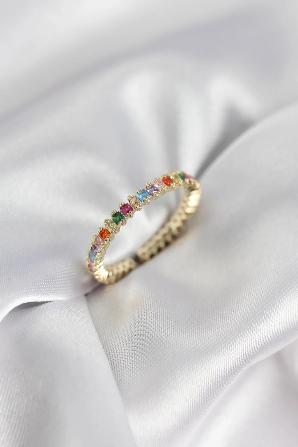 Mey İthalat® Sıralı Karışık Renkli Gold Renk Zirkon Taşlı Kadın Yüzük