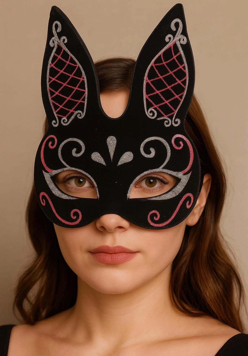 Mey İthalat® Siyah Renk Kırmızı Beyaz Simli Siyah Süet Kaplama Tavşan Maskesi 18x16 cm