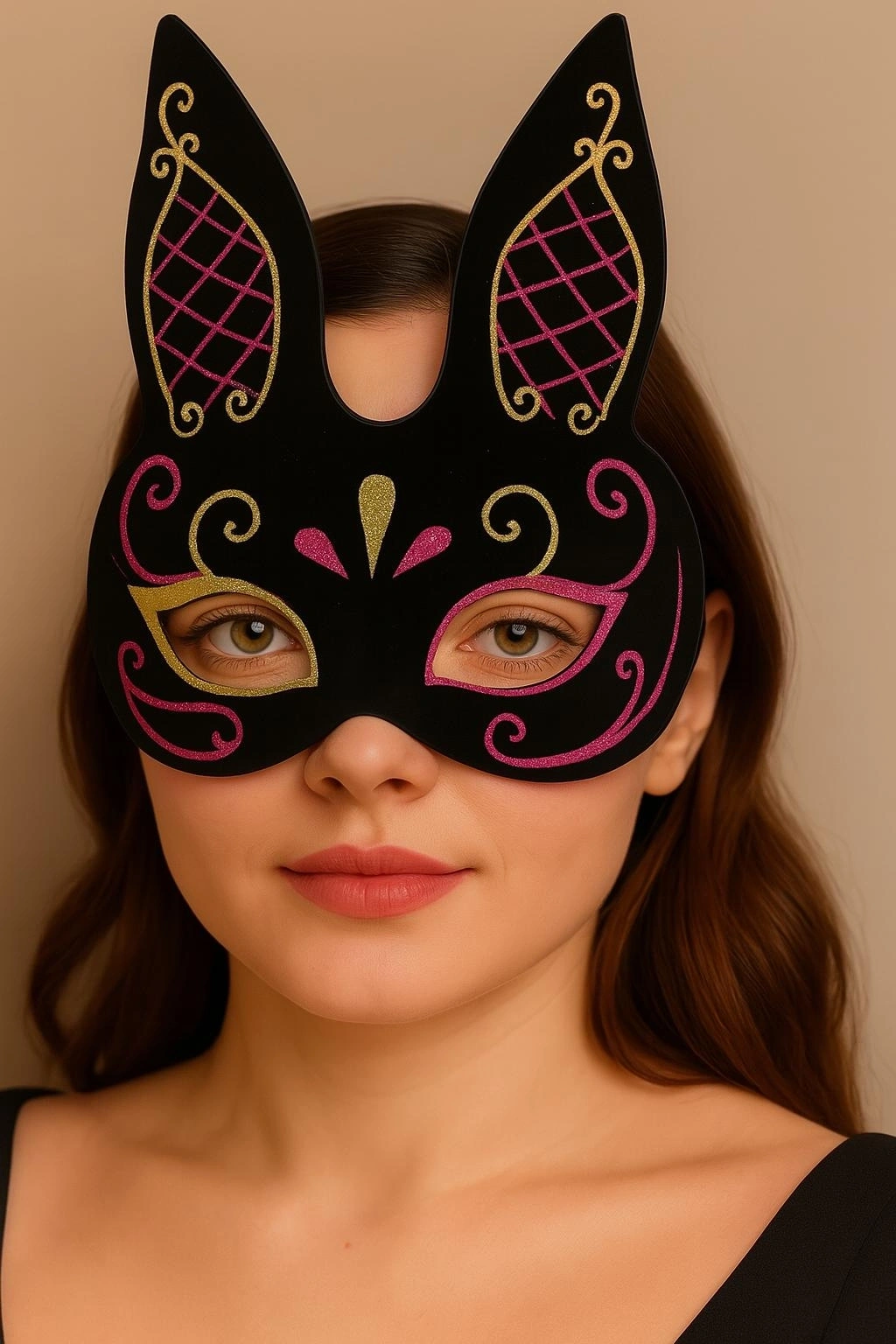 Mey İthalat® Siyah Renk Kırmızı Gold Simli Siyah Süet Kaplama Tavşan Maskesi 18x16 cm