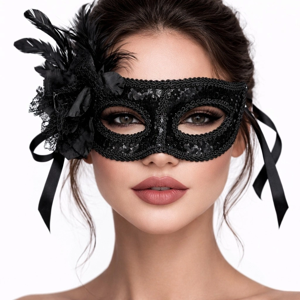 Mey İthalat® Siyah Venedik Parti Maskesi – Çiçekli Tüylü Payetli