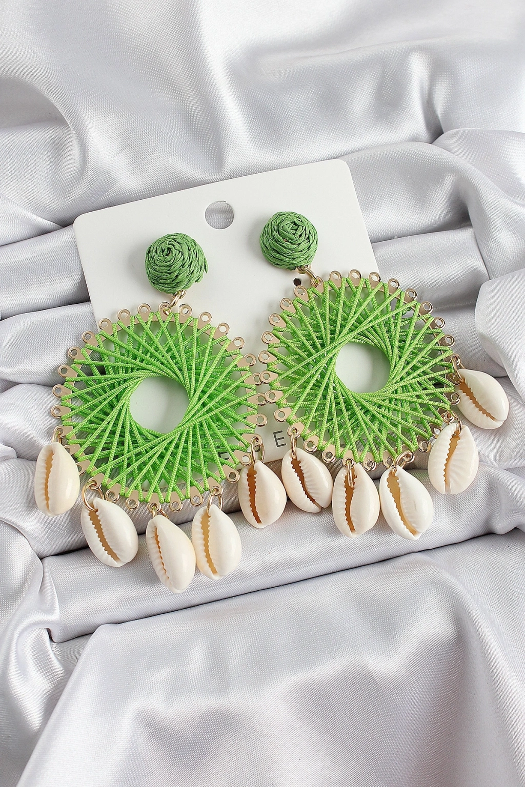 Mey İthalat® Yeşil Hasır Örgü Sarmal Model Sallantılı Deniz Kabuğu Detaylı Gold Renk Kadın Küpe