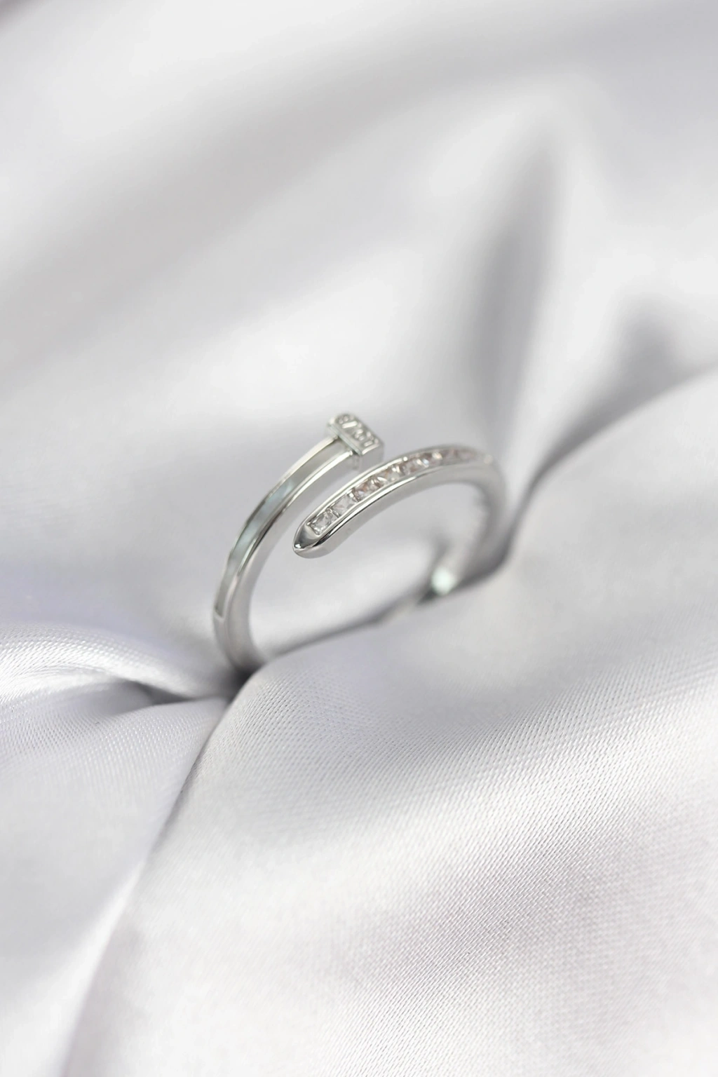 Mey İthalat® Zirkon Taşlı Gümüş Renk Yassı Çivi Model Kadın Yüzük