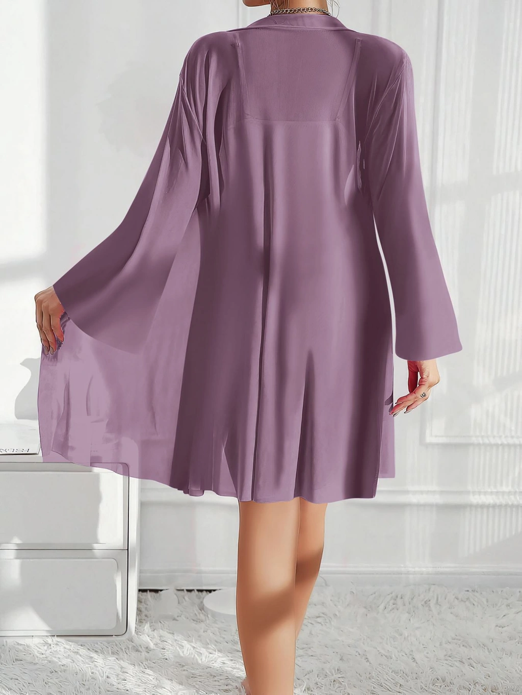 Özel Tasarım Dantel İşlemeli Fırfırlı Sabahlıklı 2li Mor Gecelik Takımı, romantik detayları ve göz alıcı mor rengiyle gecelere büyüleyici bir şıklık katar. Zarif dantel işlemeler feminen bir dokunuş sunarken, fırfırlı tasarım takıma hareketli ve romantik bir hava kazandırır.