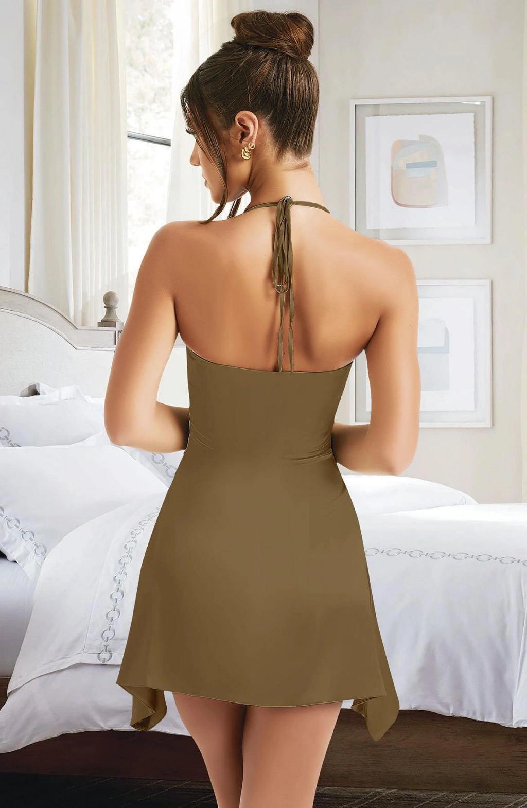 Özel Tasarım İnce Askılı Boyundan Bağlamalı Koyu Yeşil Mini Saten Gecelik, sofistike rengi ve zarif tasarımıyla gecelere etkileyici bir dokunuş katıyor. Boyundan bağlamalı detayı, omuz ve dekolte hattını estetik biçimde vurgularken ince askılarıyla feminen bir duruş sunar.