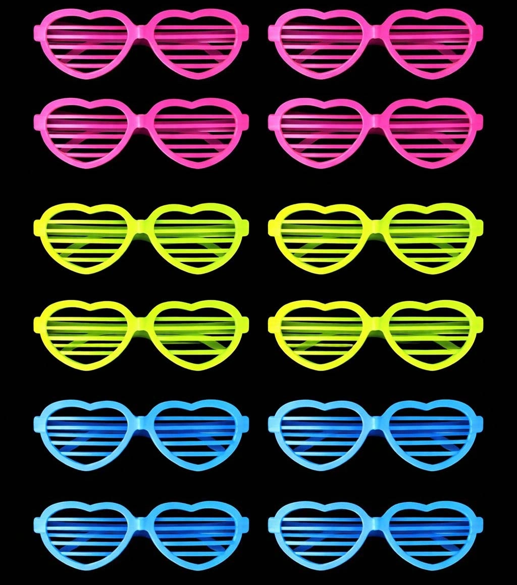 RETRO NEON FOSFORLU KALP PANJUR GÖZLÜK - 12 ADETÜrün ÖzellikleriRetro neon fosforlu kalp panjur gözlük seti, eğlenceli kalp formu ve canlı neon renkleriyle parti ve organizasyonlara enerjik bir hava katar. Kalp şeklindeki panjur tasarım, klasik gözlüklerden ayrılarak özellikle karanlık ortamlarda fosforlu etkisiyle dikkat çeker ve fotoğraf çekimlerinde güçlü bir görsel sunar. Hafif ve dayanıklı plastik malzemeden üretilmiş olması sayesinde uzun süreli kullanımlarda rahatsızlık vermez; yetişkin kullanımına uygun ölçüleriyle konforlu bir deneyim sağlar. Set içerisinde pembe, neon yeşil ve mavi olmak üzere üç farklı renk dengeli şekilde yer alır; bu sayede grup etkinliklerinde uyumlu dağıtım ve renk çeşitliliği sunar. Doğum günü partileri, bekarlığa veda organizasyonları, festivaller, konsept eğlenceler ve sosyal medya çekimleri için ideal olan bu gözlükler, eğlenceli tarzınızı tamamlar ve organizasyonlarınıza renk katar.Paket İçeriği12 adet Retro Neon Fosforlu Kalp Panjur Gözlük Seti (pembe, neon yeşil ve mavi renklerden oluşan set)