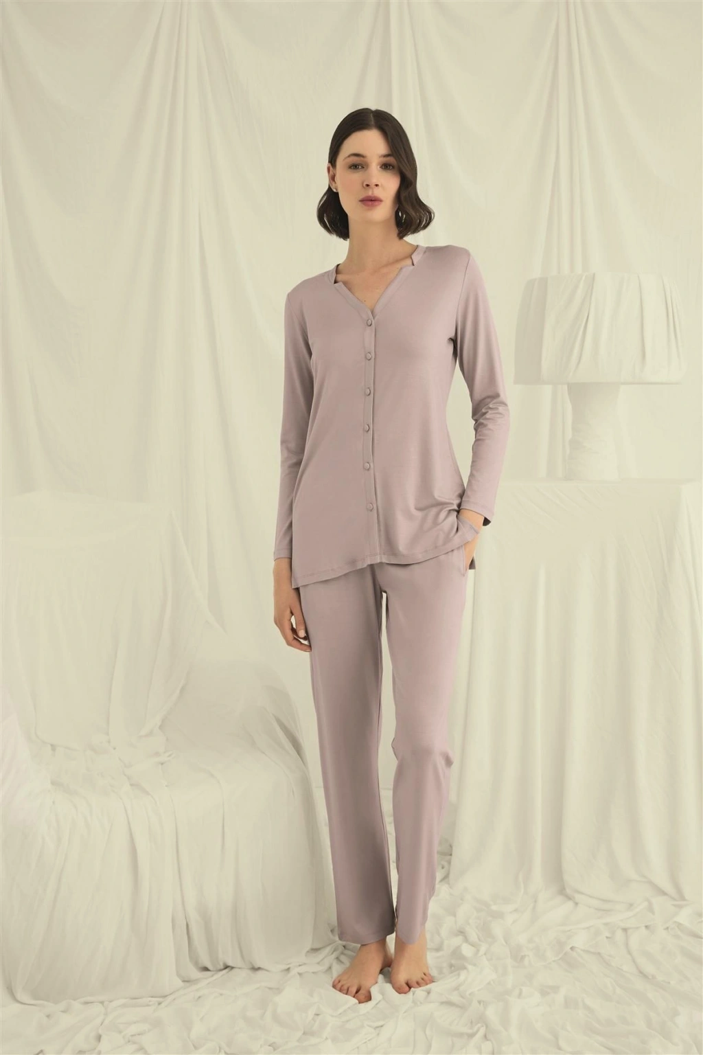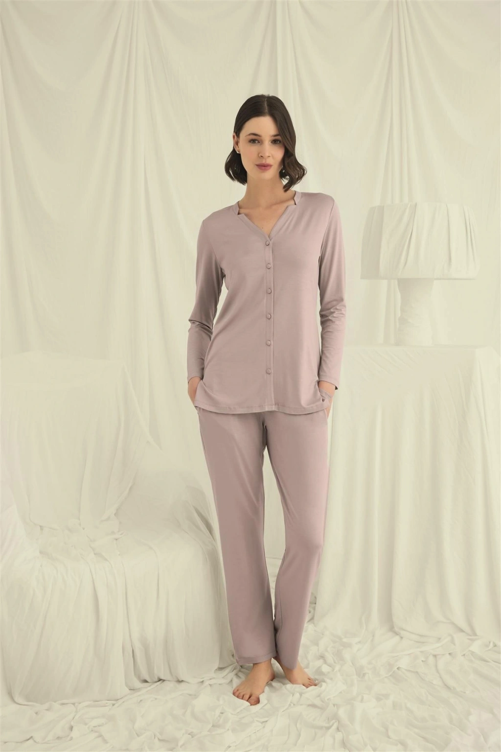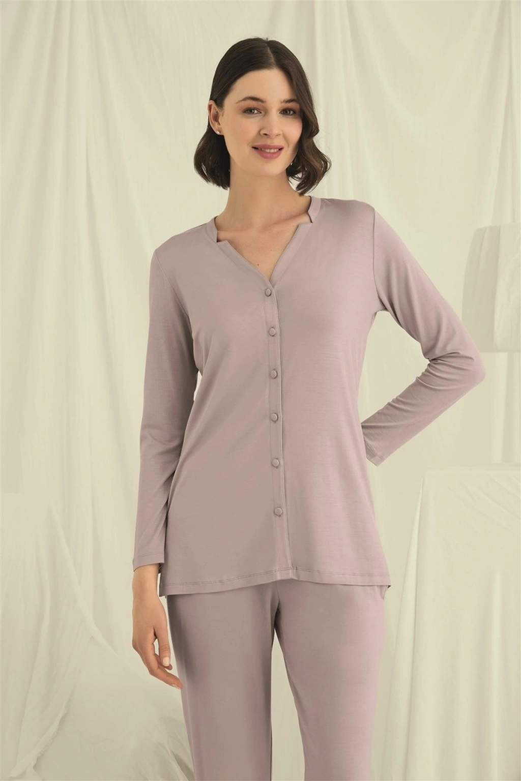 Üst: Vizon renklidir, V yakalıdır, önü boydan düğmelidir, uzun kolludur, örme kumaştır.Alt: Vizon renklidir, ceplidir, örme kumaştır.