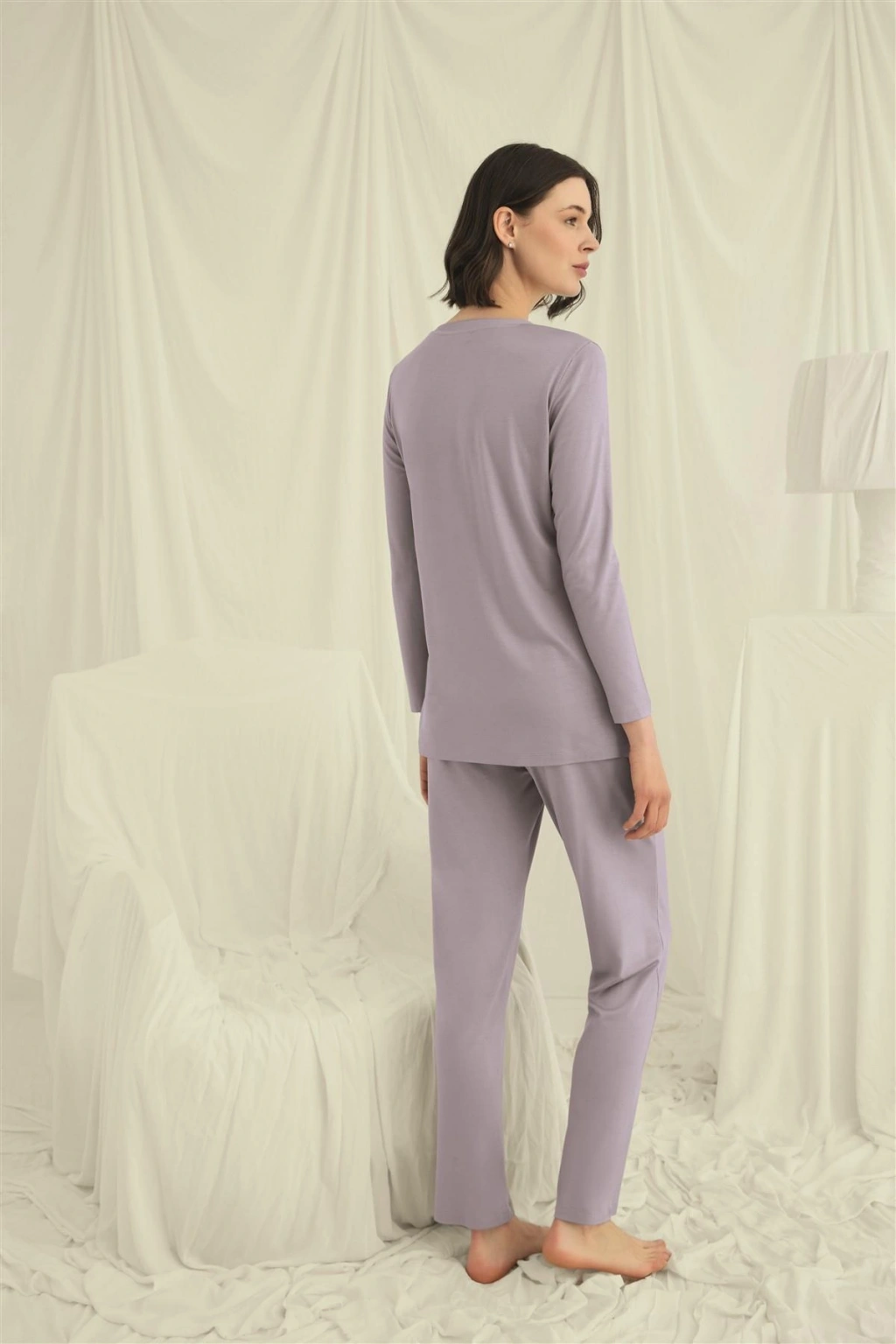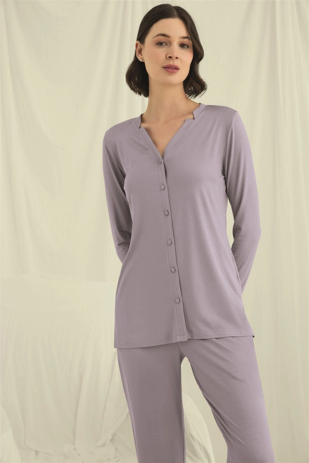 Üst: Gri renklidir, V yakalıdır, önü boydan düğmelidir, uzun kolludur, örme kumaştır.Alt: Gri renklidir, ceplidir, örme kumaştır.