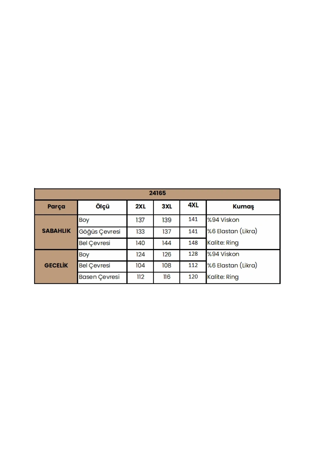 Gecelik: Somon renklidir, derin V yaka dekoltelidir, ayarlanabilir ip askılıdır, yırtmaçlıdır, yakası dantellidir, büyük bedendir, örme kumaştır.